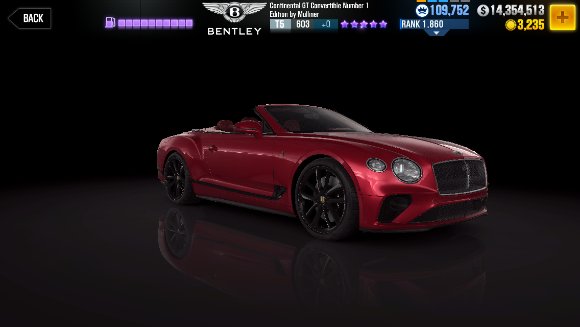 Bentley Tier 5 Stock Max Model Continental GT3 Rating 612 704 Price Limited Time Offer Power 600 914 Engine 40 L twin-turbocharged V8 Weight 2855 2419 Drivetrain. Stage 6 Transmission coming soon To run a time of 12248s with the Bentley Continental GT Speed you will need to have all Stage 5 upgrades installed and all fusion. CSR2 Bentley Continental GT Speed 11372 on half mile with only Nitrous stage 6.
